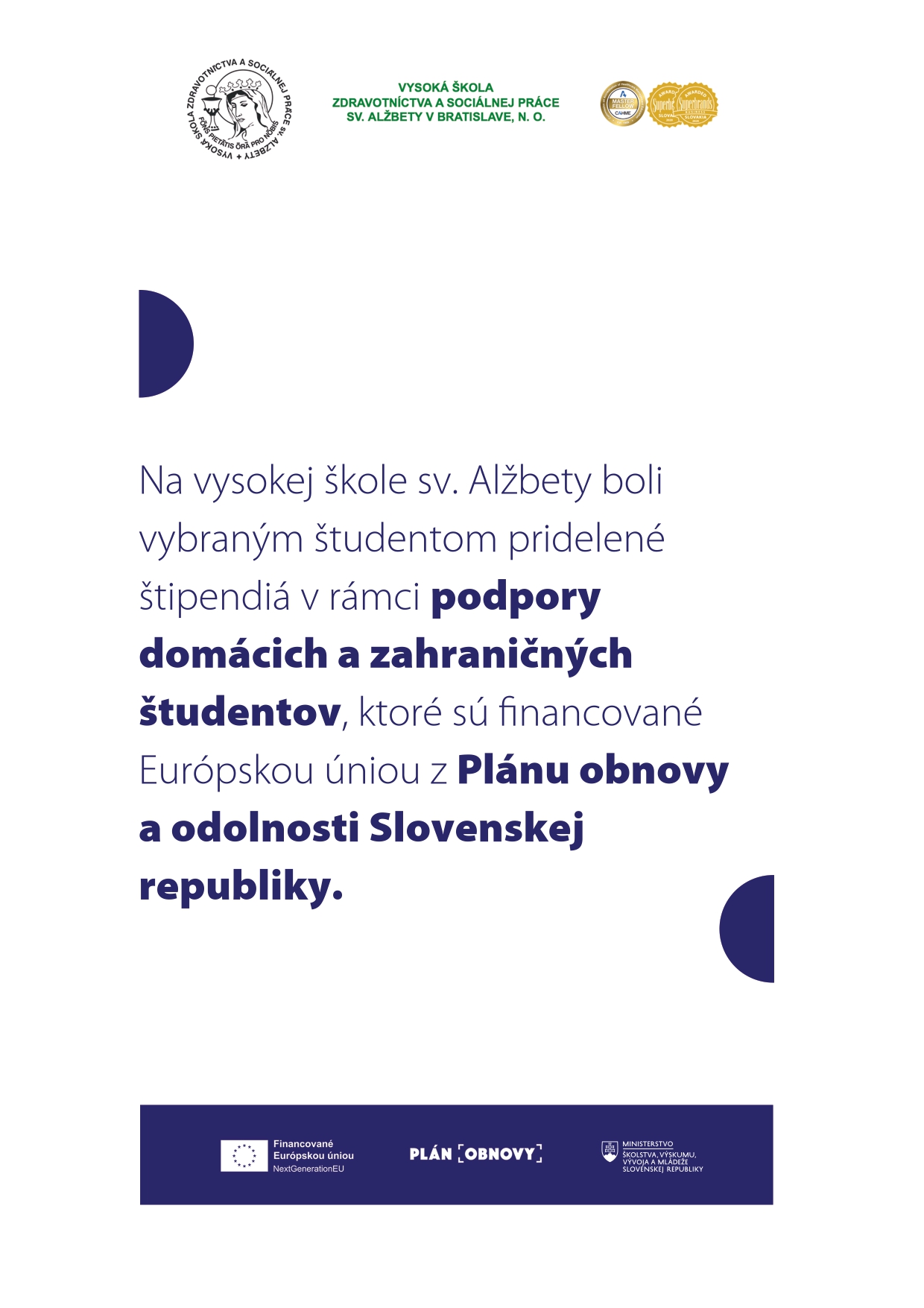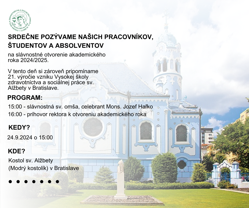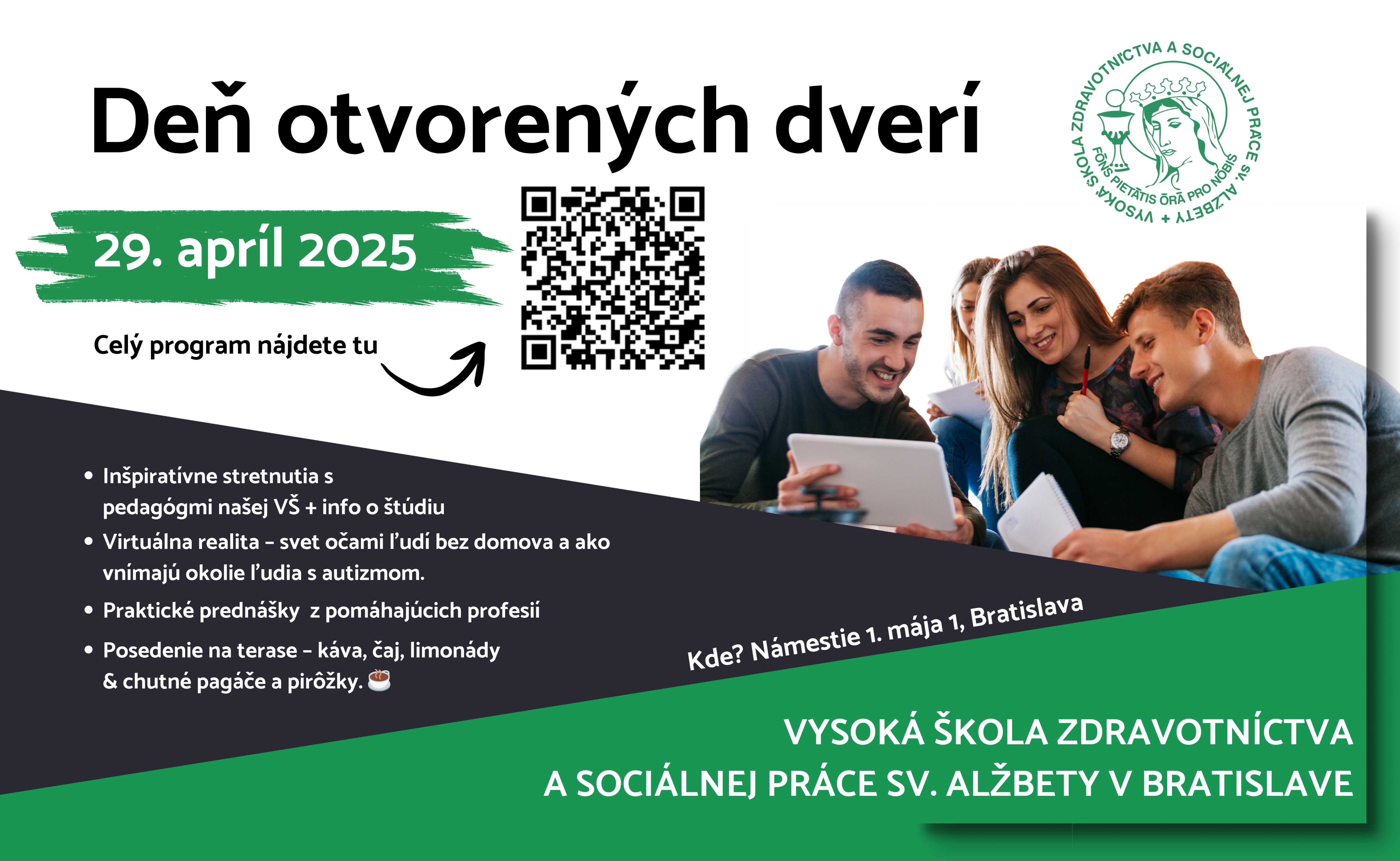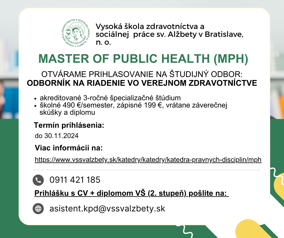 Rektor Vysokej školy zdravotníctva a sociálnej práce  sv. Alžbety v Bratislave oznamuje, že v akademickom roku 2024/2025 sa otvára 4 ročné externé doktorandské štúdium v študijných odboroch: Verejné zdravotníctvo a Zdravotnícke vedy - Laboratórne vyšetrovacie metódy v zdravotníctve - jazyk  slovenský. viac info tu