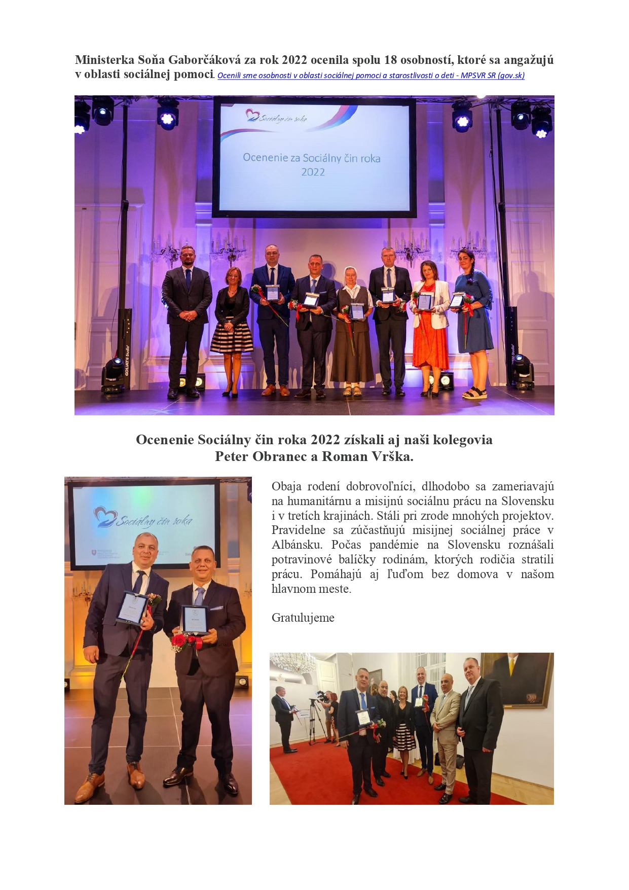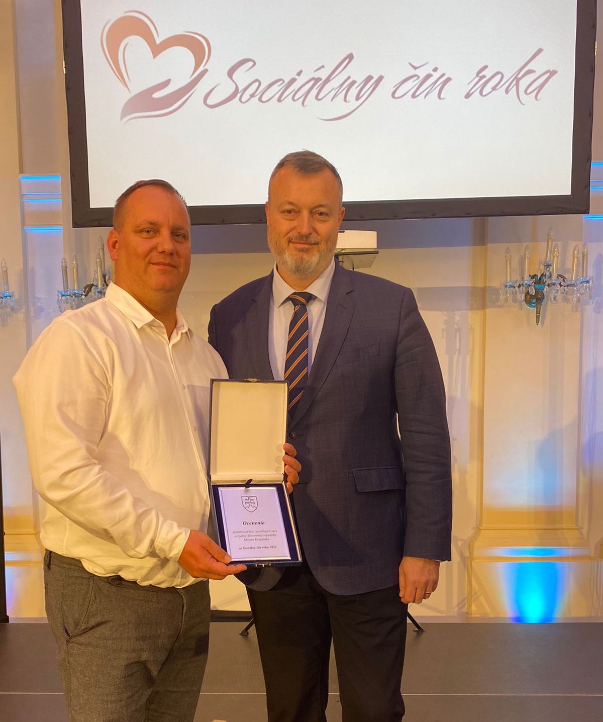 Obrovské ocenenie pre našu školu, z rúk predsedu NRSR a ministra práce soc. vecí a rodiny si prevzal náš Mgr. Rastislav Hochman, kvestor a organizátor pomoci migrantov a bezdomovcov, ako sociálny pracovník roku za sociálny čin roka 2022. Gratulujeme a ďakujeme všetkým z jeho teamu, čo mu pomáhajú u nás  na rektoráte, v Jarnej, Pruskom, Dolnej Krupej, atď. Ten istý deň získala aj naša p. doc. Demitrovičová z Ústavu zdravotníckych disciplín (UZD), ocenenie Lekár roku. Gratulujeme jej aj všetkým, čo jej na UZD pomáhali.