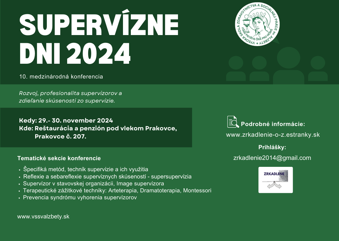 Pozývame vás na medzinárodnú konferenciu SPOLUPRÁCA POMÁHAJÚCICH PROFESIÍ POĽSKO – ČESKO – SLOVENSKÉ ŠTÚDIE v Poľsku - Ksiezowka, Zakopane, ktorá sa bude konať 18. – 19. októbra 2024. (Viac info tu)