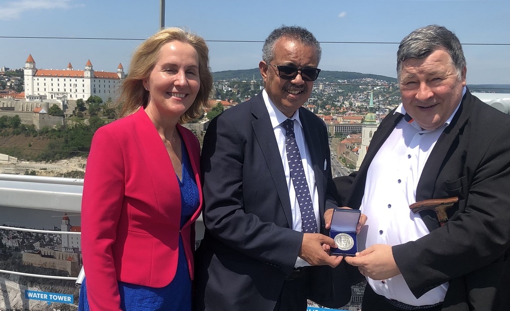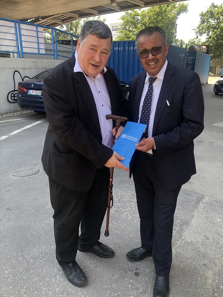 Zakladateľ VŠ zdravotníctva s sociálnej práce sv. Alžbety, prof. Vladimír Krčméry a prof. Eva Grey na stretnutí s generálnym riaditeľom svetovej zdravotníckej organizacie WHO, Dr. Tedrosom Adhanom Ghebreyesusom