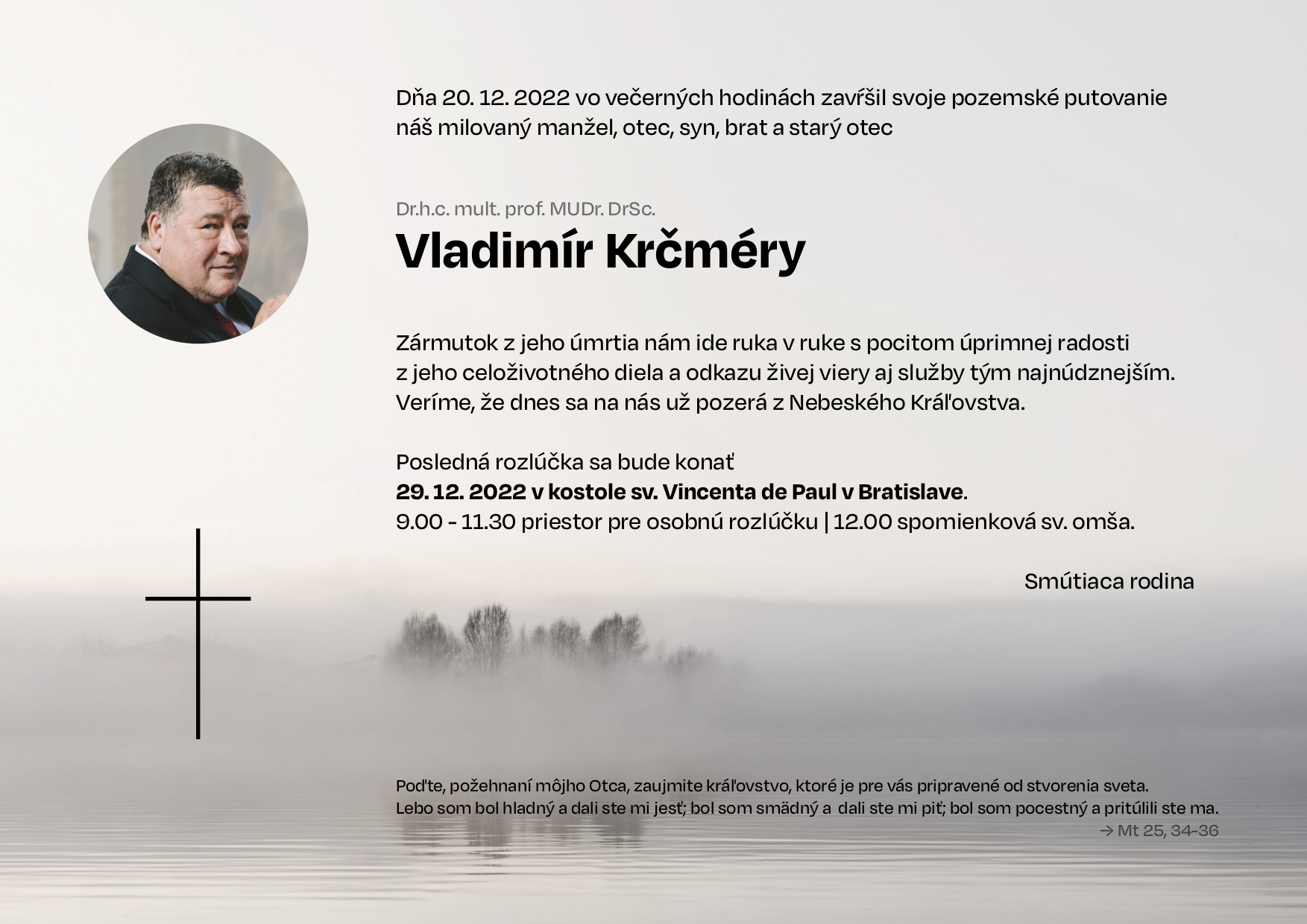 Pohrebnú sv. omšu za prof. Vladimíra Krčméryho bude vysielať TV LUX naživo o 12:00 dnes 29.12.2022, alebo ju môžete sledovať aj na youtubovom kanále farnosti Prievoz: https://youtube.com/@farnostbratislavaprievoz