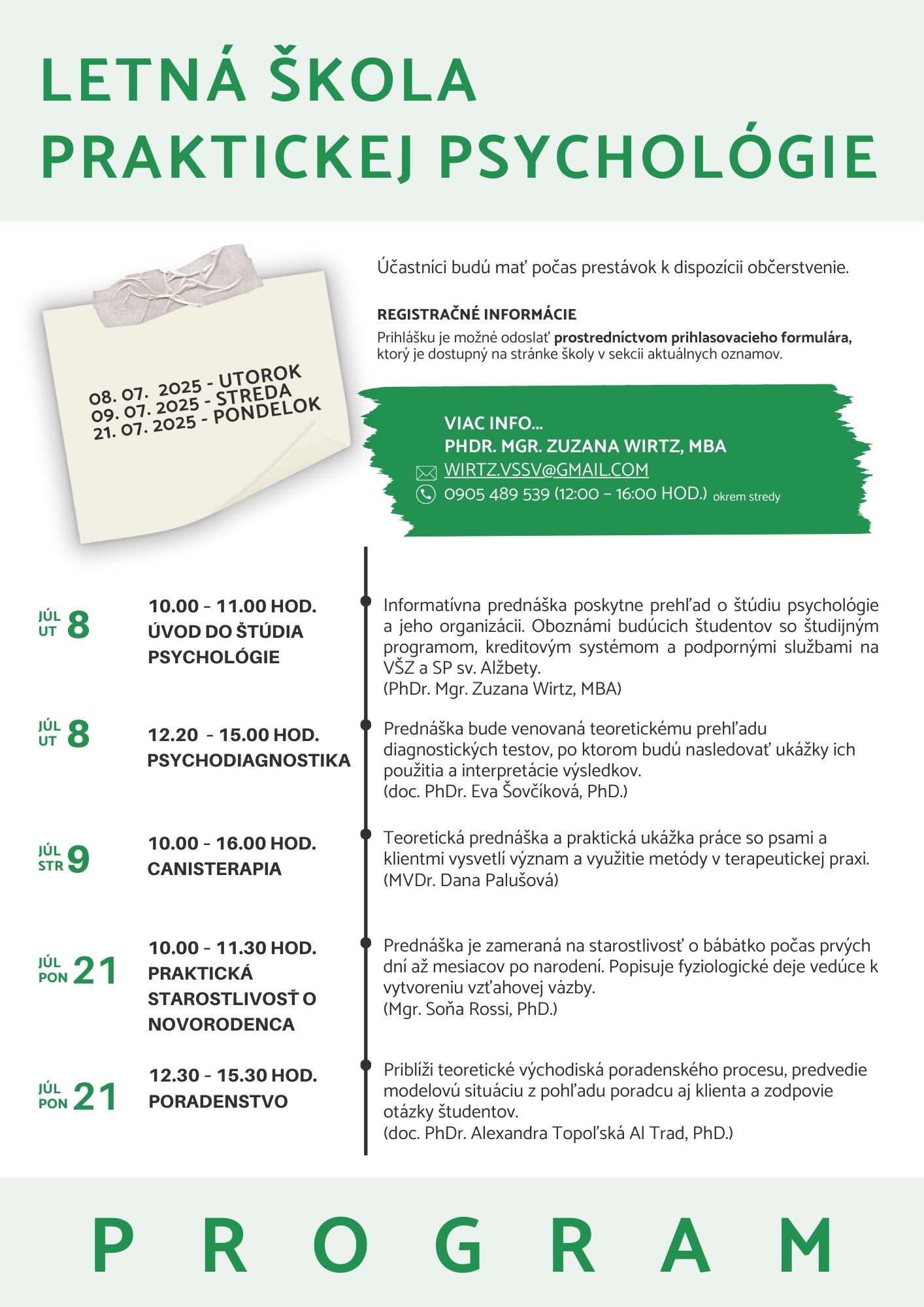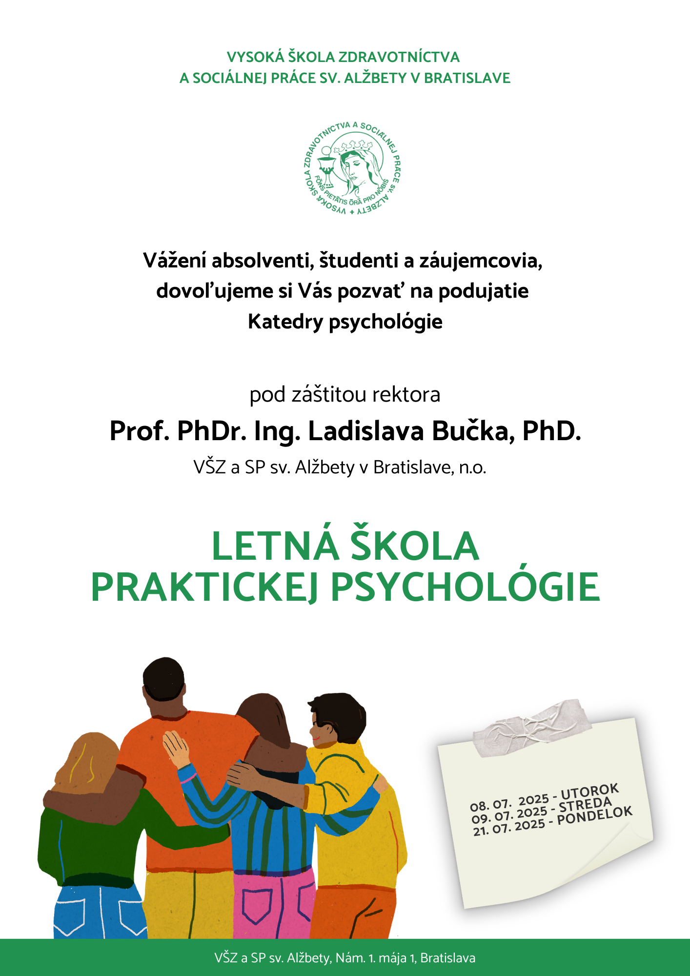 Vážení absolventi, študenti a záujemcovia, dovoľujeme si Vás pozvať na podujatie Katedry psychológie pod záštitou rektora Prof. PhDr. Ing. Ladislava Bučka, PhD. VŠZaSP sv. Alzbety v Bratislave, n.o. na LETNÚ ŠKOLU PRAKTICKEJ PSYCHOLÓGIE. (Prihlasovací formulár / Program / Harmonogram)