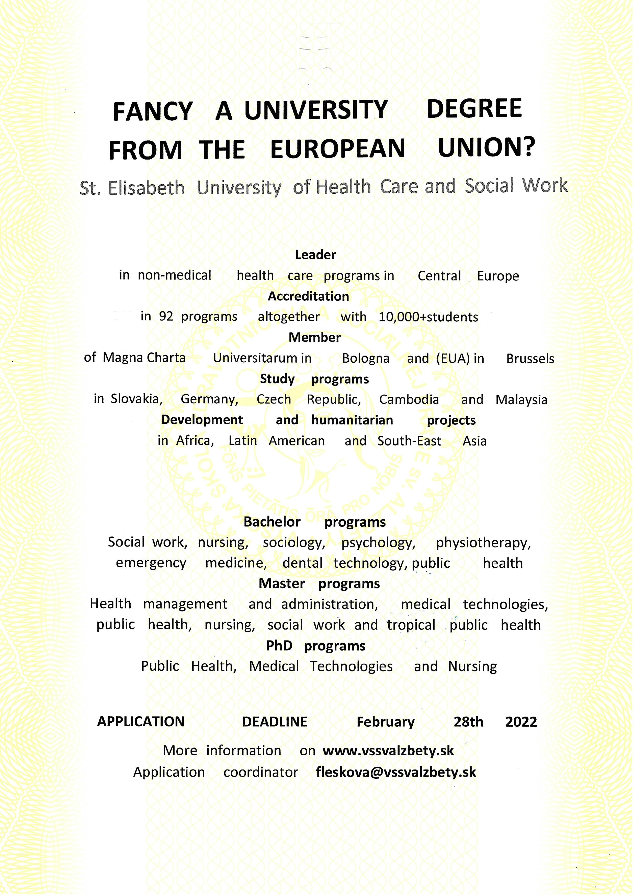 Upozornenie - korešpondenčná adresa od 1.12020: VŠ zdravotníctva a sociálnej práce sv. Alžbety, n.o. P.O.BOX 104 81001 Bratislava