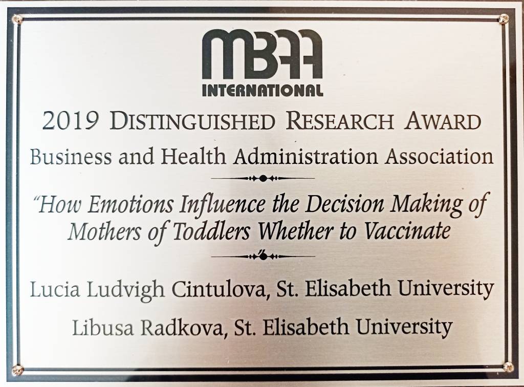 r. 2019 - MBAA INTERNATIONAL BEST PAPER AWARDS - prvýkrát v histórii dostali neameričania - doc. Mgr. Lucia Ludvigh Cintulová PhD. a prof. Ing. Mgr. Libusa Radková PhD. - viac tu