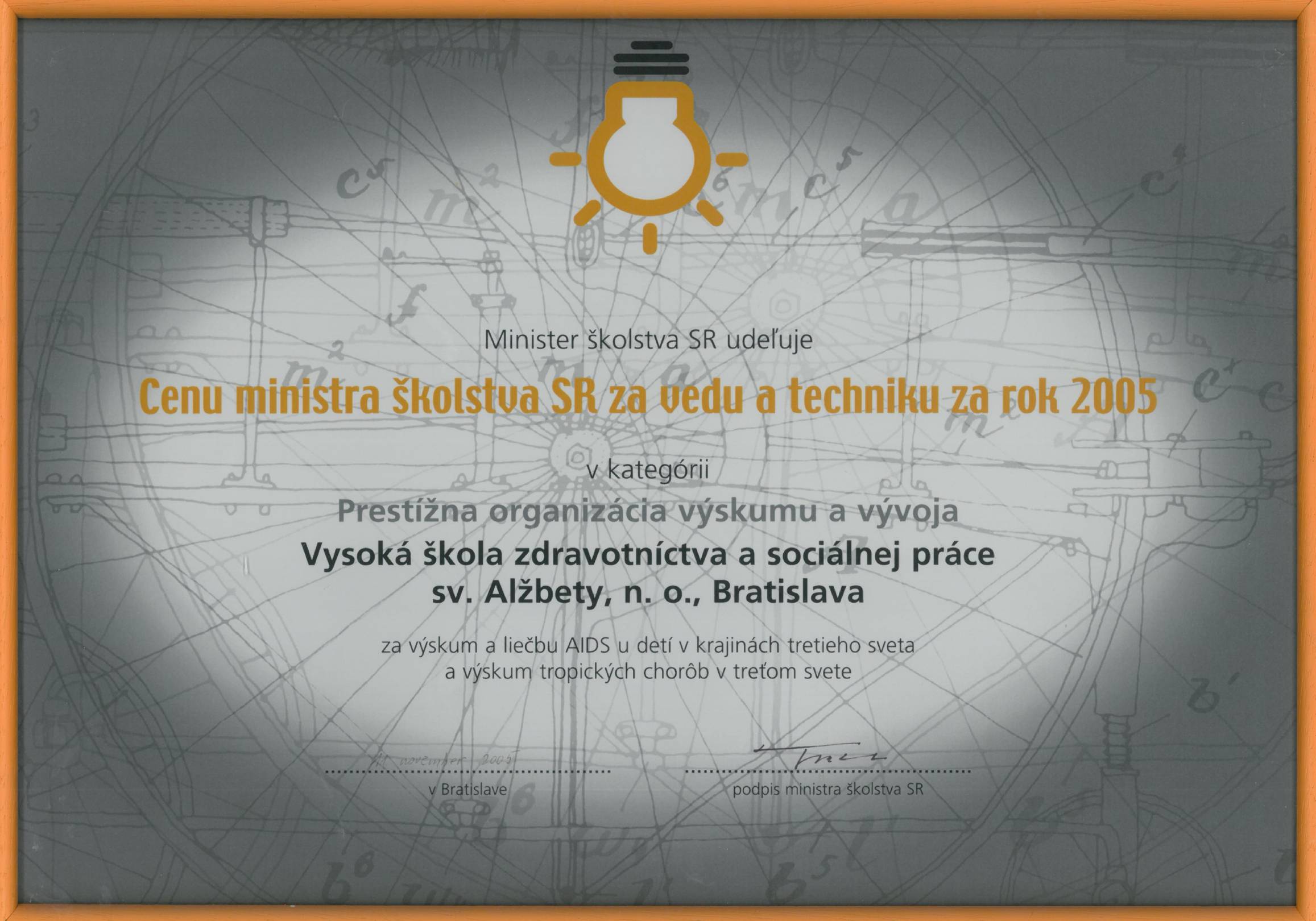 r. 2005 - Cena ministra školstva, vedy, výskumu a športu SR pre Vysokú školu zdravotníctva a soc. práce sv. Alžbety v kategórii ,,Prestížna organizácia výskumu a vývoja“ za výskum a liečbu AIDS u detí v krajinách tretieho sveta a výskum tropických chorôb v treťom svete,